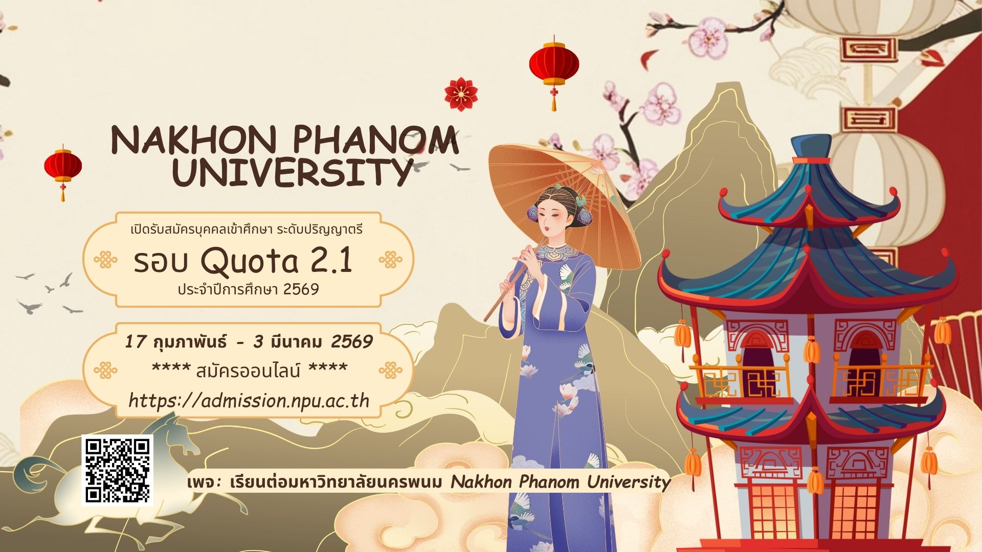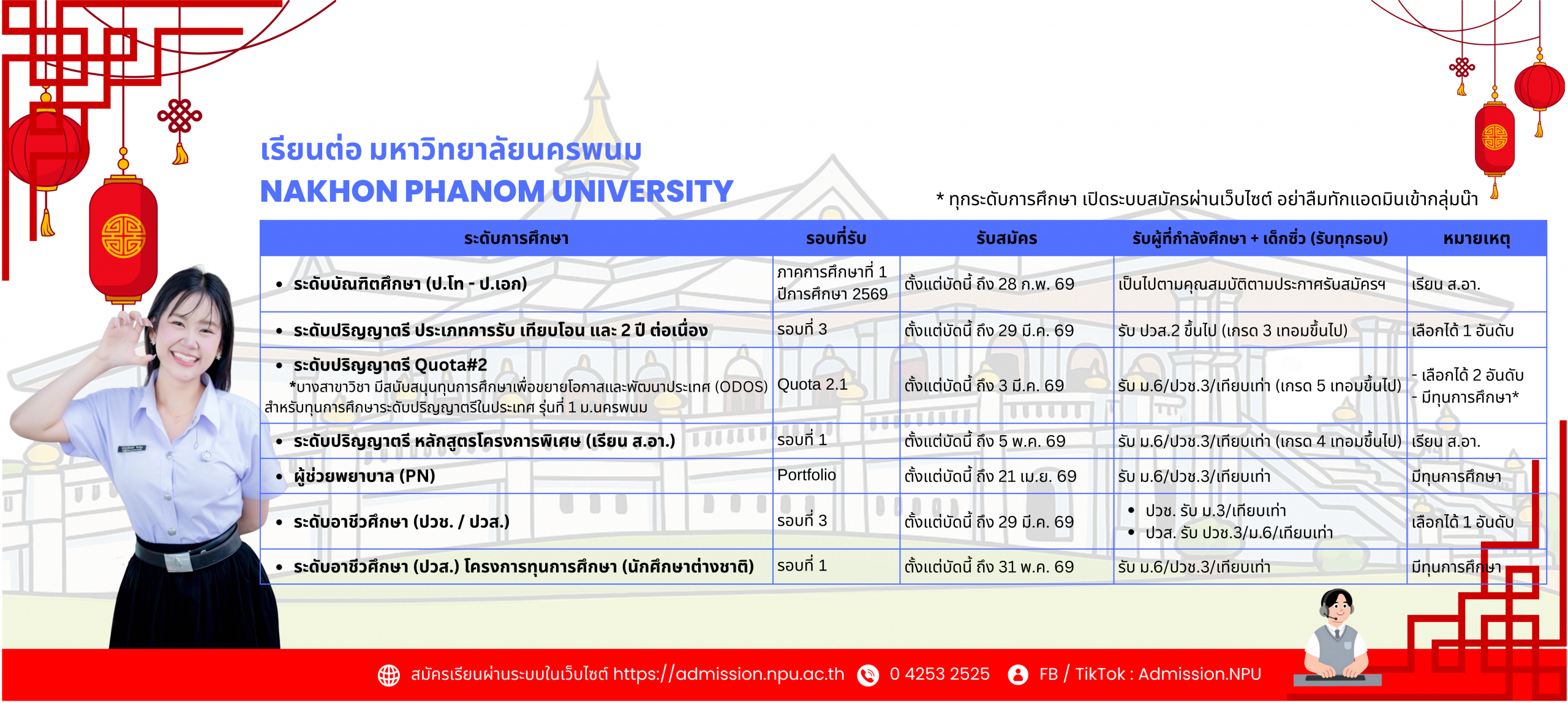 Portfolio 1.3 (1)รับสมัครทุกระดับการศึกษาPort & Quota 2569 (พรีเซนเทชั่น)ปก-admission (1920 x 600 px) (2) Our Courses Nakhon Phanom University มหาวิทยาลัยอินดี้ ชีวิตดีดี้ มหาวิทยาลัยนครพนม Activity Show all Scholarship ทุนการศึกษา มูลนิธิทุนการศึกษา พระราชทานสมเด็จ พระบรมโอรสาธิราช สยามราชกุมาร สูงสุด 55,000 บาท ทุนการศึกษาเฉลิมราชกุมารี สูงสุด 55,000 บาท ทุนพระราชทาน พระราชทานนักเรียน เพื่อการศึกษาสงเคราะห์ สูงสุด 45,800 บาท ทุนการศึกษา ในพระราชานุเคราะห์ (มูลนิธิราชประชานุ เคราะห์ ในพระบรม ราชูปถัมภ์) สูงสุด 18,000 บาท ทุนการศึกษา มูลนิธิ์อายิโน๊ะโมะโต๊ะ สูงสุด 106,400 บาท ทุนการศึกษา มูลนิธิเครือเจริญ โภคภัณฑ์ ทุนเรียนฟรี 70% ทุนการศึกษา ประเภทต่อเนื่อง (จนสำเร็จการศึกษา) ทุนรายปี และ ทุนอื่น ๆ อีกมากมาย กองทุนเงินให้กู้ยืมเพื่อการศึกษา กยศ. สามารถติดต่อ : งานทุนการศึกษา/กองทุนเงินให้กู้ยืมเพื่อการศึกษา กองพัฒนานักศึกษา มหาวิทยาลัยนครพนม ชั้น 1อาคารสำนักงานอธิการบดี (หลังใหม่) มหาวิทยาลัยนครพนม 063-047-8349 งานทุนการศึกษา กองพัฒนานักศึกษา มหาวิทยาลัยนครพนม