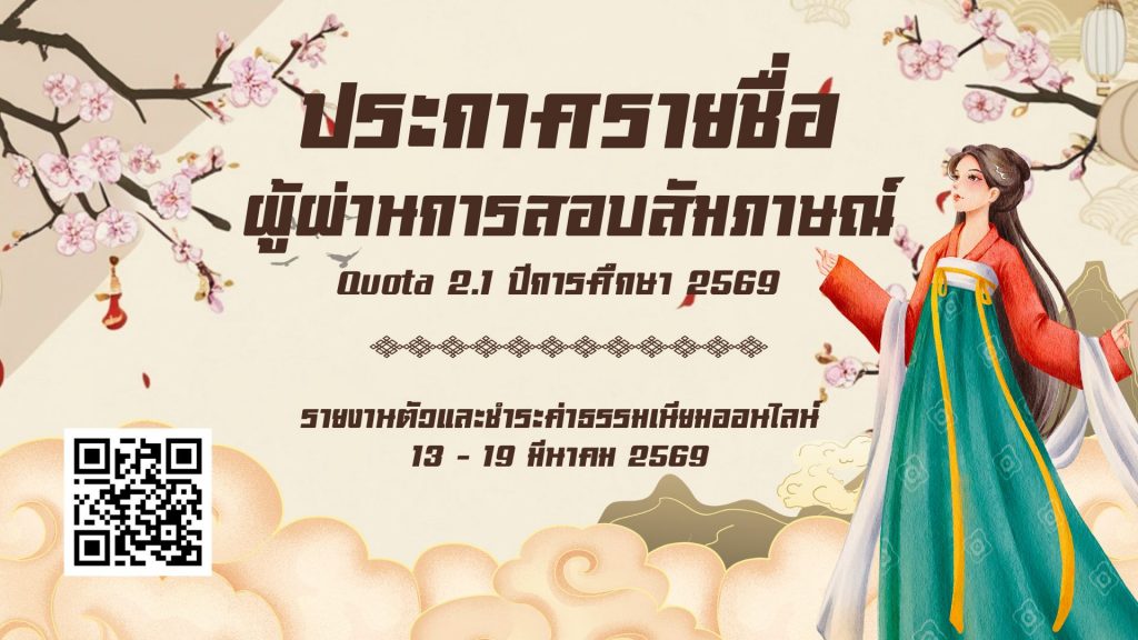 ประกาศรายชื่อผู้ผ่านการสอบสัมภาษณ์และมีสิทธิ์เข้าศึกษา ระดับปริญญาตรี รอบ Quota 2.1 ประจำปีการศึกษา 2569By admin admin / 13 มีนาคม 2569
