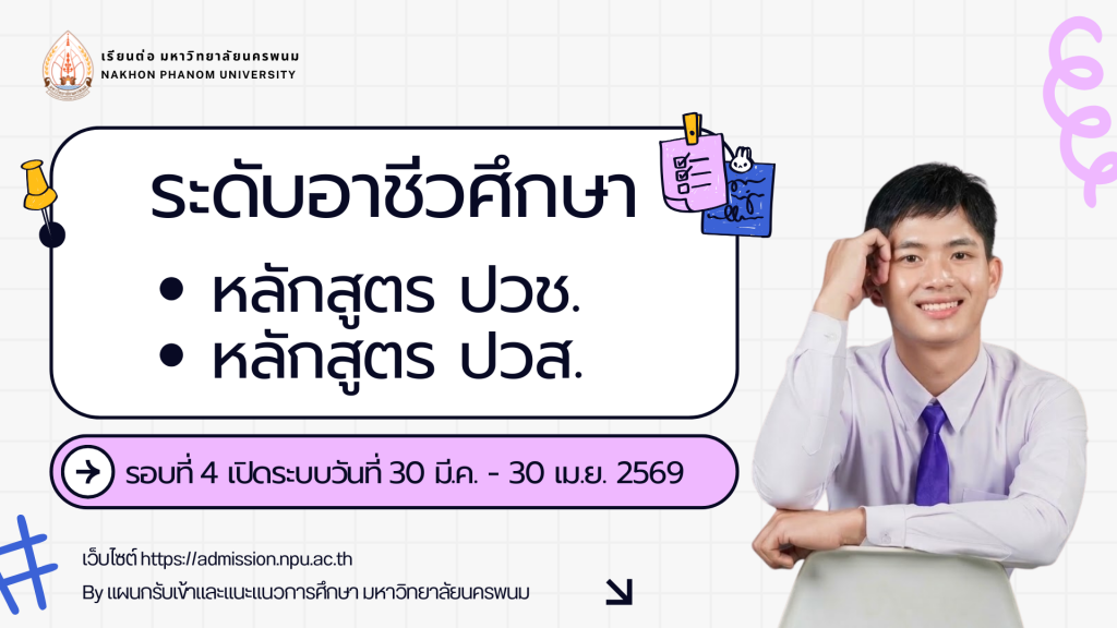 ประกาศรับสมัครบุคคลเข้าศึกษาในระดับอาชีวศึกษา หลักสูตรประกาศนียบัตรวิชาชีพ (ปวช.) และหลักสูตรประกาศนียบัตรวิชาชีพชั้นสูง (ปวส.) (รอบที่ 4) ประจำปีการศึกษา 2569By admin / 19 มีนาคม 2569