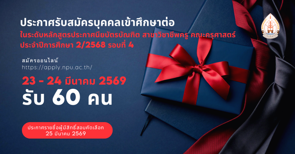 ประกาศรับสมัครบุคคลเข้าศึกษาต่อในระดับหลักสูตรประกาศนียบัตรบัณฑิต สาขาวิชาชีพครู คณะครุศาสตร์ ประจำปีการศึกษา 2/2568 รอบที่ 4By admin admin / 24 มีนาคม 2569