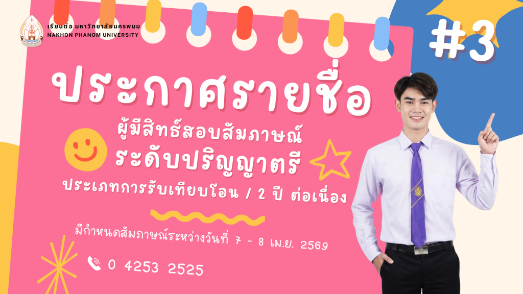 ประกาศรายชื่อผู้มีสิทธิ์สอบสัมภาษณ์ เพื่อเข้าศึกษาต่อในมหาวิทยาลัยนครพนม ระดับปริญญาตรี ประเภทการรับเทียบโอน และ 2 ปี ต่อเนื่อง ประจำปีการศึกษา 2569 (รอบที่ 3)By admin / 1 เมษายน 2569